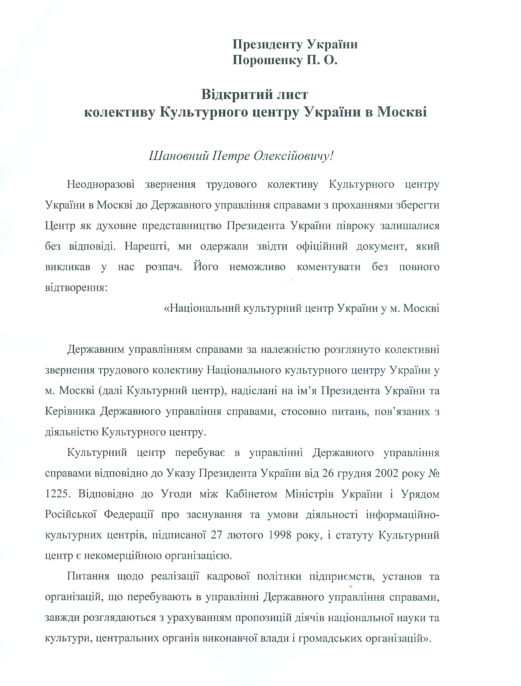 Культурный центр Украины в Москве снова просит Порошенко о защите (ДОКУМЕНТ)