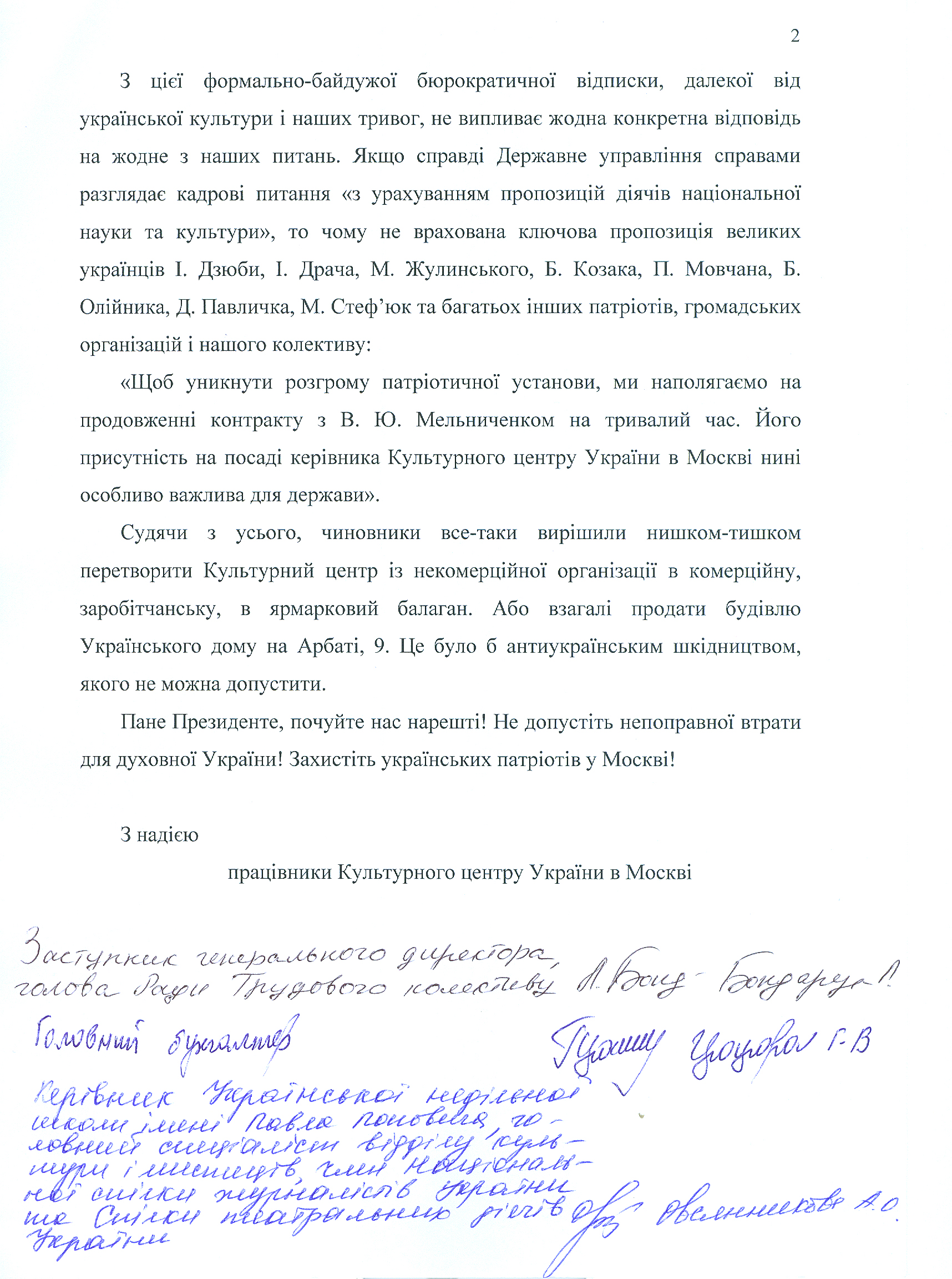 В документе говорится, что, спустя полгода молчания, чиновники ДУСа официально ответили на многочисленные обращения коллектива. Однако в письме нет конкретных ответов относительно продления контракта с нынешним руководителем Культурного Центра В.Е. Мельниченко. А лишь указывается, что «вопросы о реализации кадровой политики всегда рассматриваются с учетом предложений деятелей национальной науки и культуры».