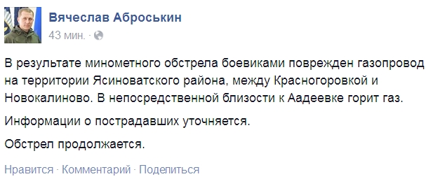«В непосредственной близости к Авдеевке горит газ. Информации о пострадавших уточняется», - написал он.