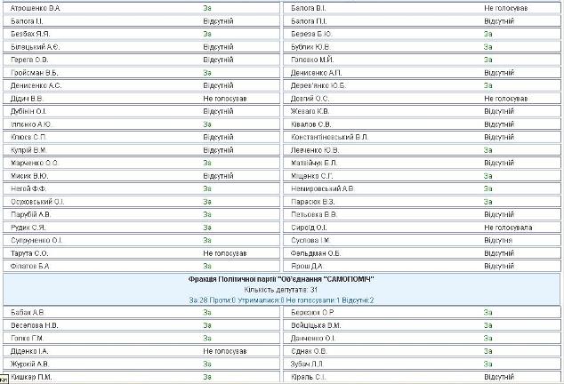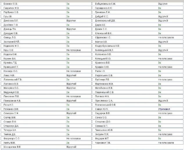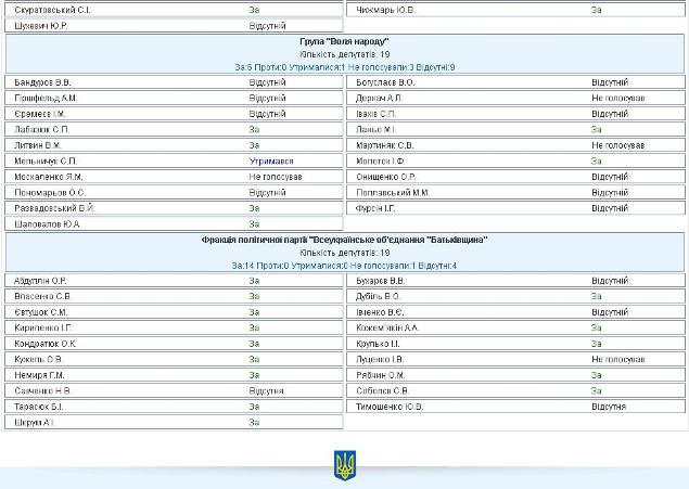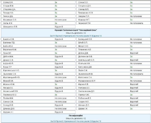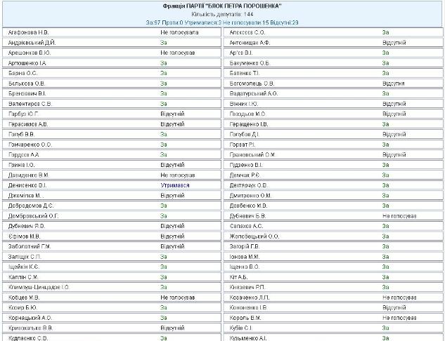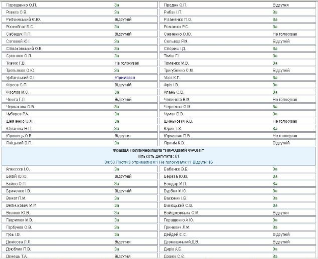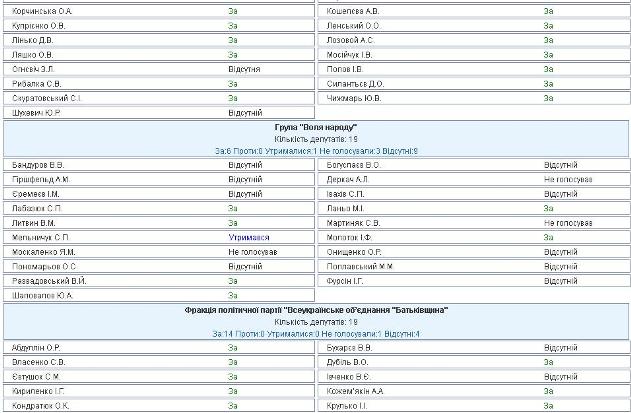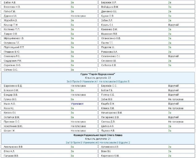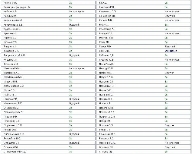 Поименный список депутатов, голосовавших за законопроект опубликован на сайте Верховной Рады и выглядит так: