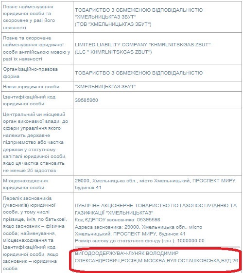 По данным Единого государственного реестра, учредителями ООО «Хмельницкгаз сбыт» является ОАО «Хмельницкгаз» и Владимир Луняк из Москвы.