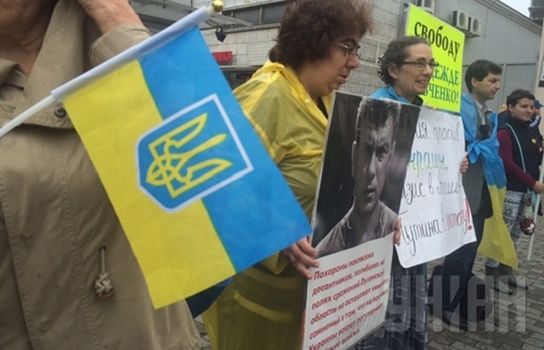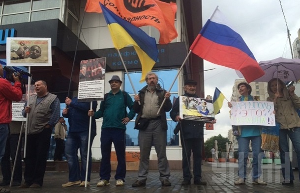 Участники антивоенного пикета держат в руках плакаты: "Свободу Надежде Савченко", "Мариуполь - это Украина", "С войной надо заканчивать", "Агрессия против Украины, кризис в России - Путина в отставку!".