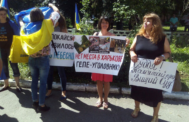 Перед зданием суда, где слушается дело мэра Харькова, проходит митинг. Около 50 митингующих держат плакаты: «Нет места в Харькове Гепе-уголовнику», «Судья помни о высшем суде» и др.