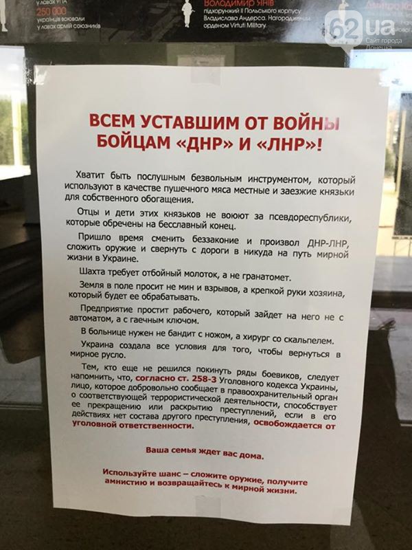 В Славянске по всему городу расклеены объявления с призывом к боевикам, уставшим от войны, сложить оружие и сдаться украинским властям. Фото одного из объявлений, размешенного на здании горсовета, опубликовала на своей странице в Фейсбук журналист Лина Кущ.