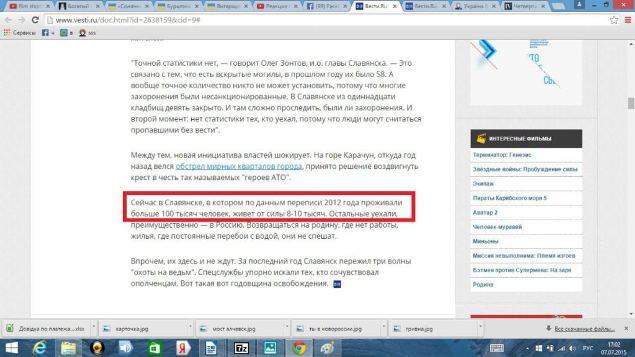 В конце публикации сообщают: «Сейчас в Славянске, в котором по данным переписи 2012 года проживали больше 100 тысяч человек, живет от силы 8-10 тысяч. Остальные уехали, преимущественно — в Россию. Возвращаться на родину, где нет работы, жилья, где постоянные перебои с водой, они не спешат».