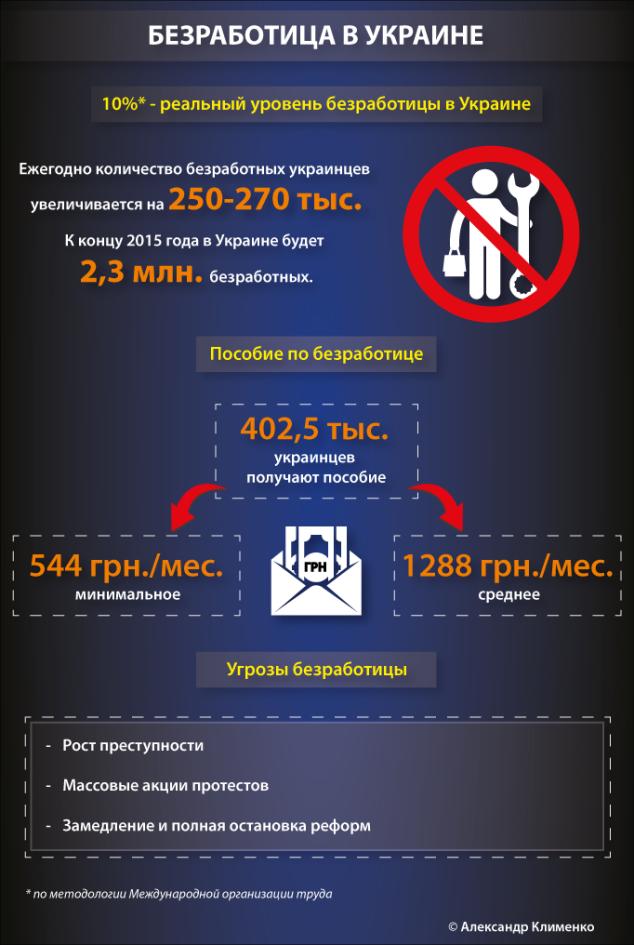 Причем, Клименко, занимавший до начала 2014 года пост министра доходов и сборов, отмечает, что в этой статистике не учитывается скрытая безработица: «Есть масса работников, переведенных на сокращенный рабочий день, «голую» ставку без надбавок, трехдневную рабочую неделю и т.д.».