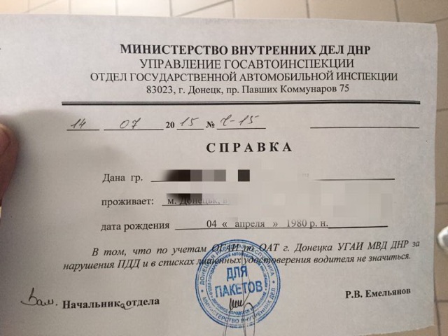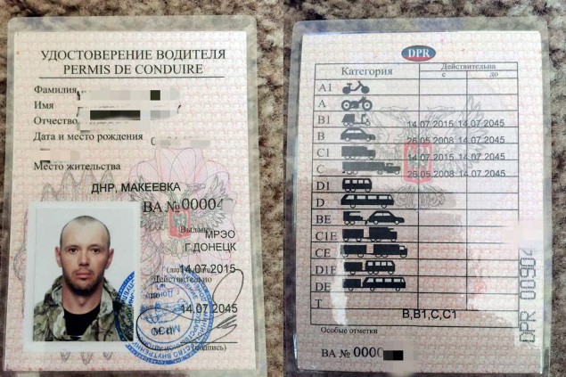 Новое удостоверение категории В, В1, С, С1, выданное 14 июля 2015 года, имеет печать «министерства внутренних дел» «ДНР».