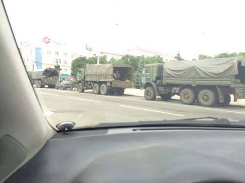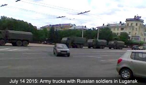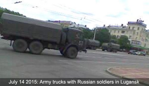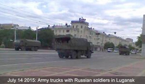 Во вторник, 14 июля, по центральной улице оккупированного Луганска проехал десяток военных тентованных грузовиков. В 12:40 в районе памятника Тарасу Шевченко, расположенного на улице Советской, остановились 4 КамАЗа.