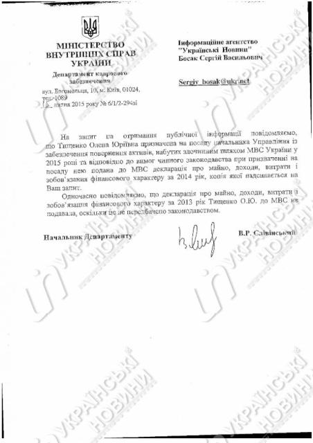Министерство внутренних дел Украины после неоднократных обращений СМИ предоставило копию Декларации о доходах за 2014 год новоназначенной начальника Управления по обеспечению возвращения активов, добытых преступным путем Елены Тищенко.