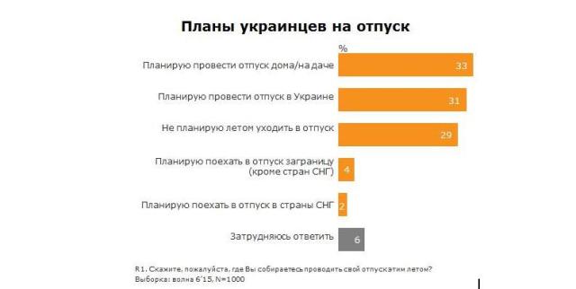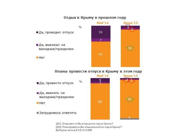 В этом году провести отпуск в Крыму планируют всего 2% украинцев. Согласно исследованию TNS On-line Track за июнь 2015 года, 64% украинцев планируют провести отпуск в пределах Украины или на собственной даче. Всего 6% украинцев планируют выезжать заграницу – 2% намерены провести отпуск в странах СНГ, 4% - выехать за границы СНГ.