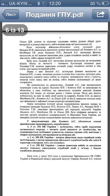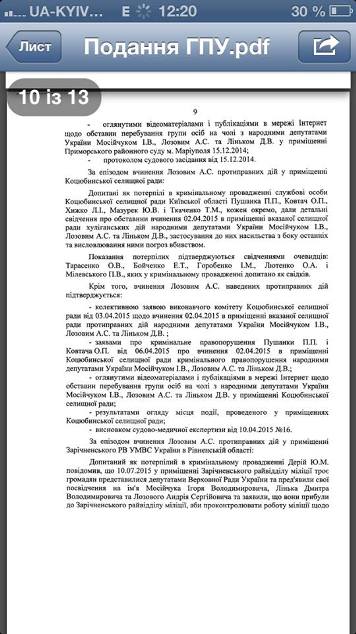 Нардепы также отметились в помещении Коцюбинского сельсовета (Киевская обл.), где они требовали от главы выделить демобилизованным участникам АТО земельные участки. Депутаты угрожали расправой главе сельсовета, после чего несколько раз ударили его, Мосийчук прижал его к стене и начал душить, а Лозовой нанес несколько ударов костылем в живот.
