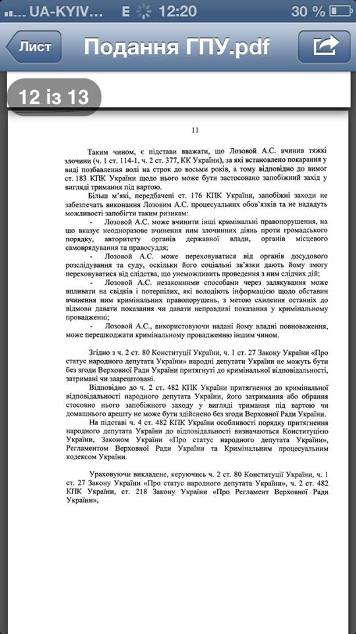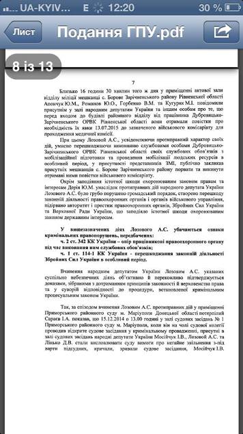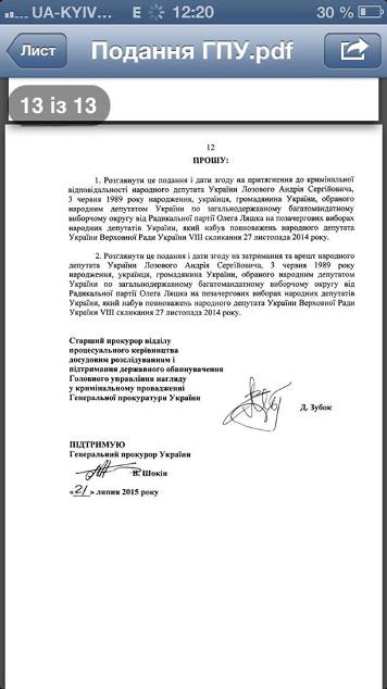 Олег Ляшко выложил на своей странице в Facebook текст представления Генпрокурора, которое Виктор Шокин внес в парламент. В нем описано, за какие правонарушения ГПУ хочет задержать народного депутата Лозового.