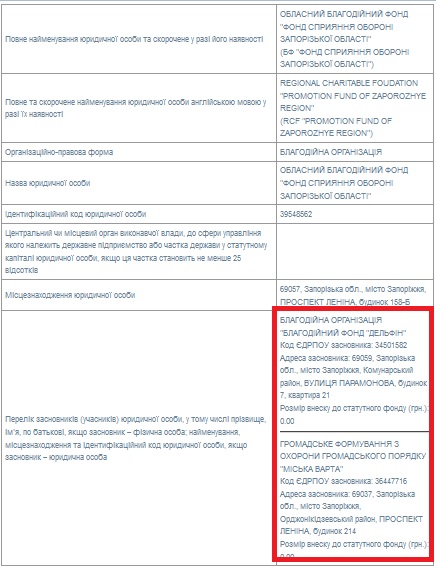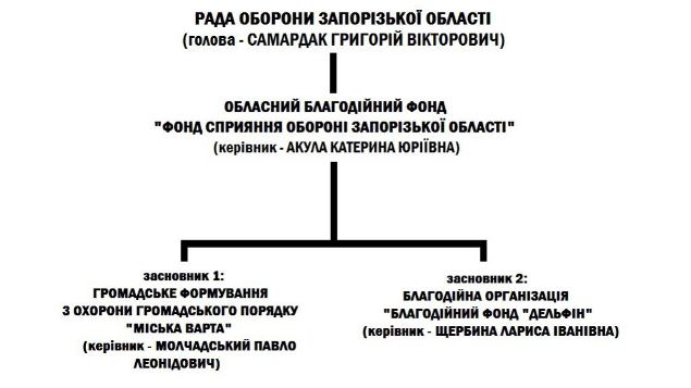 «Согласно сайту Министерства юстиции, «Фонд содействия обороне Запорожской области» учредили две организации: благотворительный фонд «Дельфин» (руководитель – Лариса Щербина) и некое «Громадське формування з охорони громадського порядку «Міська варта». С фондом «Дельфин» всё более-менее понятно: эта организация действительно существует, регулярно и не первый год помогает детям с ограниченными возможностями и в целом вопросов не вызывает. В отличие от другого учредителя «Фонда обороны области», организации «Міська варта».