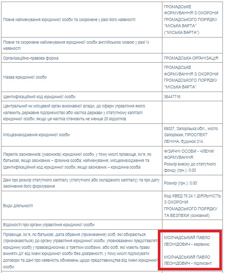 Руководителем организации «Міська варта», а значит, соучредителем «Фонда содействию обороны Запорожской области» является некий Павел Молчадский. Автору этой статьи не удалось найти ни малейших следов деятельности этой организации, равно как и телефона либо точного адреса организации (на сайте Минюста указан только номер дома по проспекту Ленина с более чем сотней квартир и множеством офисов)» — сообщает издание.