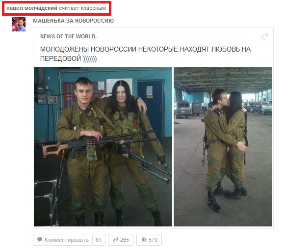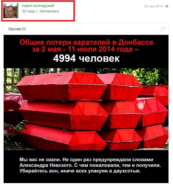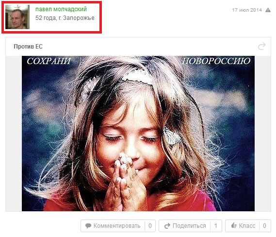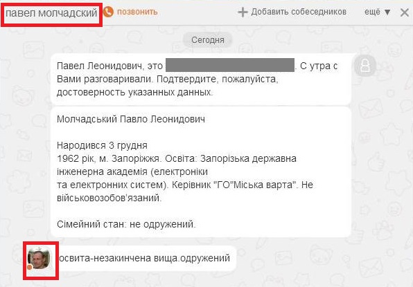 Когда же журналистам удалось обнаружить страницу Павла Молчадского в социальной сети «Одноклассники», оказалось, что соучредитель «Фонда содействия обороне Запорожской области», который собирает и тратит деньги на строительство оборонительных укреплений, регулярно размещает на ней материалы в поддержку боевиков «ДНР» и «ЛНР», а также российского президента Владимира Путина. Для того, чтобы подтвердить подлинность аккаунта Молчадского, журналисты завязали с ним личную переписку, представившись сотрудниками ОГА.