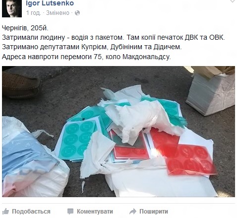 В одном из автомобилей в Чернигове были обнаружены копии с печатями участковых и окружной избирательной комиссии. Об этом сообщил в Facebook народный депутат Игорь Луценко, который вместе с коллегами задержал злоумышленника, перевзившего документацию.
