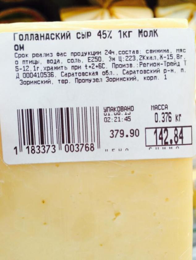 В России покупатель в одном из магазинов обнаружил, что в составе различных сортов сыров присутствует свинина, говядина и мясо птицы. Об этом на своей странице в Facebook написал житель Пензы Олег Шарипков.