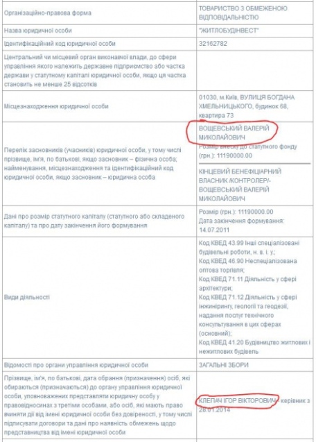 Учредителем ООО «Житлоинвестбуд» является вице-премьер-министр, член «Радикальной партии Олега Ляшко» Валерий Вощевский.