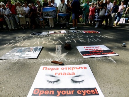 Штаб-квартиру ОБСЕ в Донецке пикетируют с плакатами и игрушками