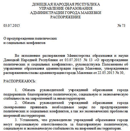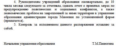 В оккупированной боевиками Макеевке Донецкой области руководителей учреждений образования обязали «предупреждать политические и социальные конфликты». Об этом говорится в распоряжении «начальника Макеевского городского управления образования «ДНР» Т.М. Пилюгиной от 3 июля этого года.