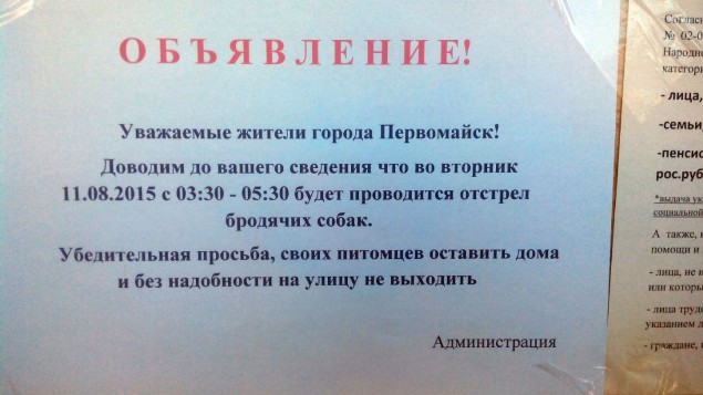 Так называемая Первомайская «городская администрация» предупреждает местных жителей, что 11 августа будет производиться обстрел бродячих собак.