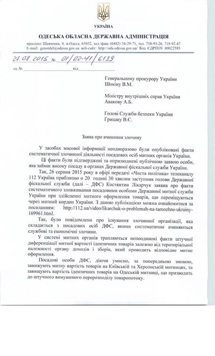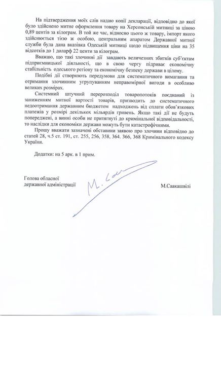Глава Одесской ОГА Михеил Саакашвили написал заявление, в котором требует от руководителей ГПУ, СБУ и МВД расследовать преступную деятельность должностных лиц Государственной фискальной службы.