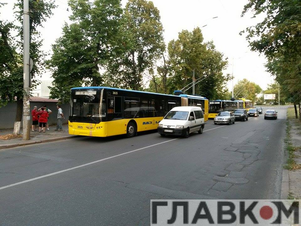 Как сообщает корреспондент, люди, которые ехали на Святошино, вышли из троллейбусов и пошли пешком в сторону метро. В данный момент не известно, когда восстановится движение.