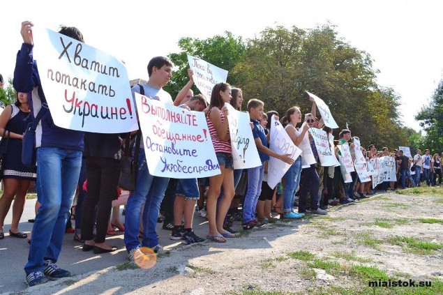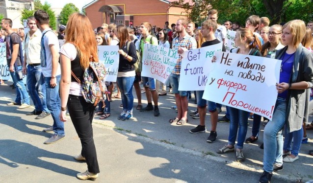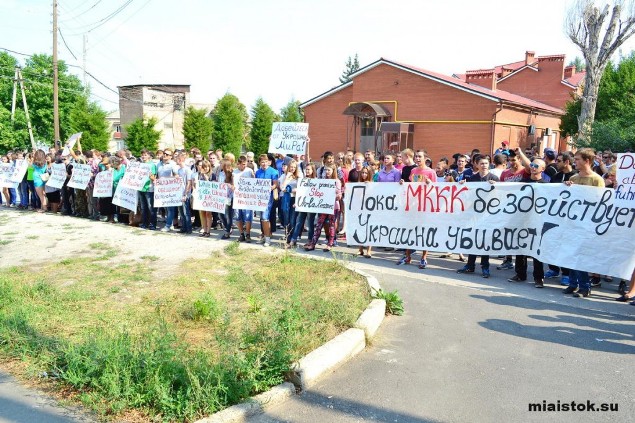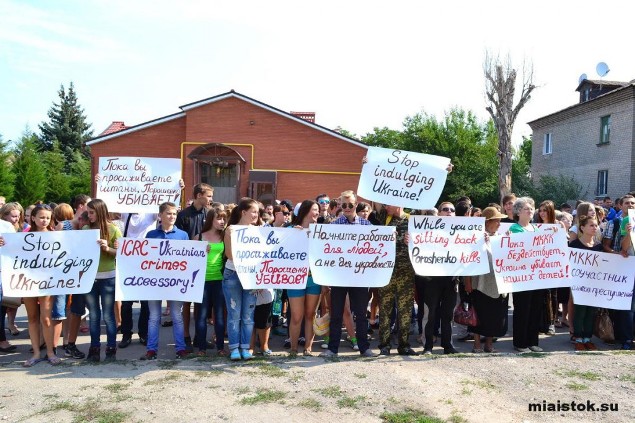Как сообщает информационное агентство сепаратистов «ЛуганскИнформЦентр», молодежь из разных городов Луганской области пришла к офису с лозунгами «Пока МККК бездействует – Украина убивает», «Добейтесь от Украины мира», «Не идите на поводу у фюрера Порошенко», «Выполняйте обещанное, остановите укробеспредел» и другими.