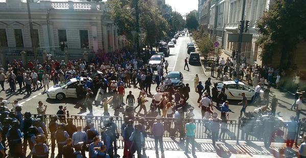 С улицы Грушевского напротив здания парламента пострадавших в столкновениях правоохранителей и людей в штатском продолжают вывозить в больничные заведения. Некоторые из пострадавших не могут ходить, и их выносят на носилках. Многие из них окровавленные.