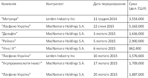 В частности, деньги переводились на счета юридических лиц, зарегистрированных на Британских Виргинских островах - MacNamara Holdings S. A. и Lerden Industry Inc. Транзакции шли от шести украинских компаний – «Ласфано Украина», «Рейкон», «Дельфин», «НИКО и К», «Укрпромекология-Инвест» и «Матрица».