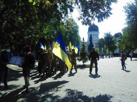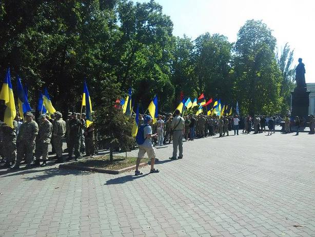 Представители «Правого сектора», «Свободы», ультрас «Черноморца», а также других организаций собрались на Соборной площади, откуда через центр города отправились в парк Шевченко.