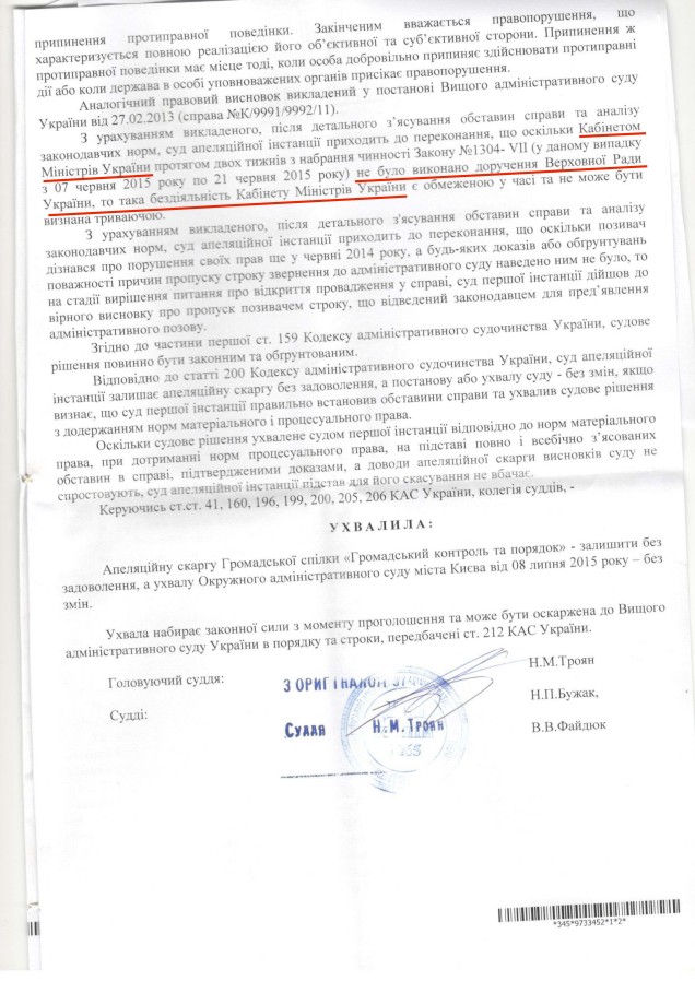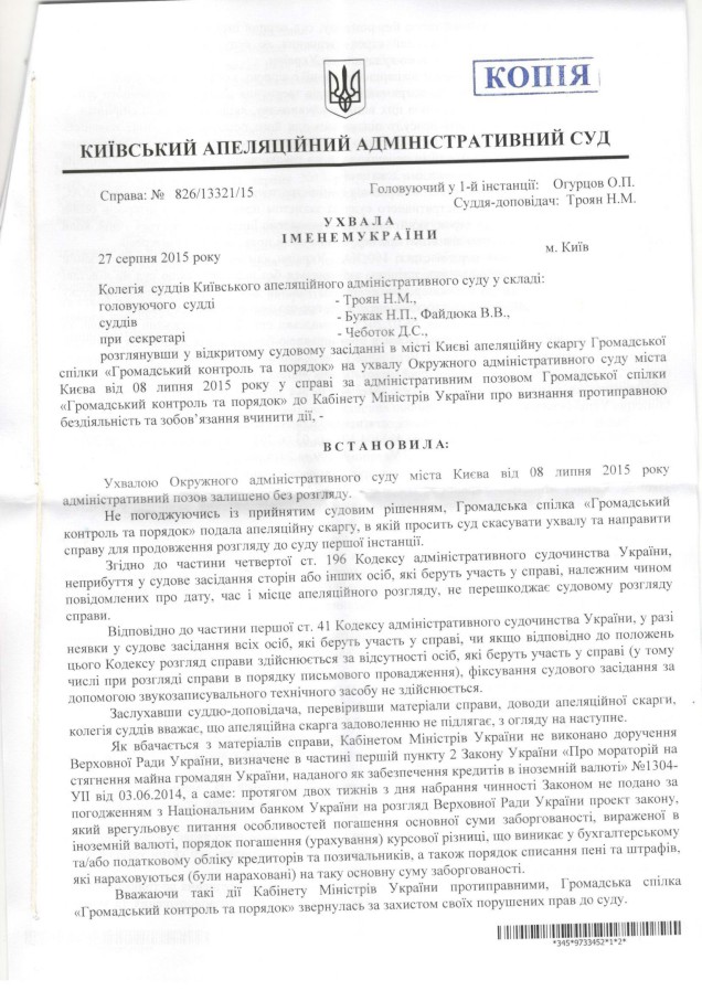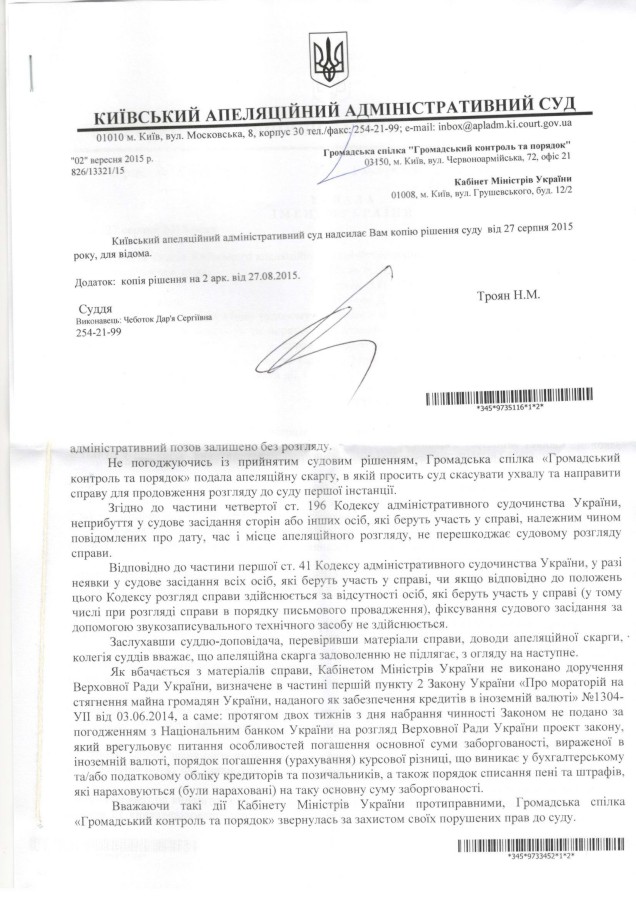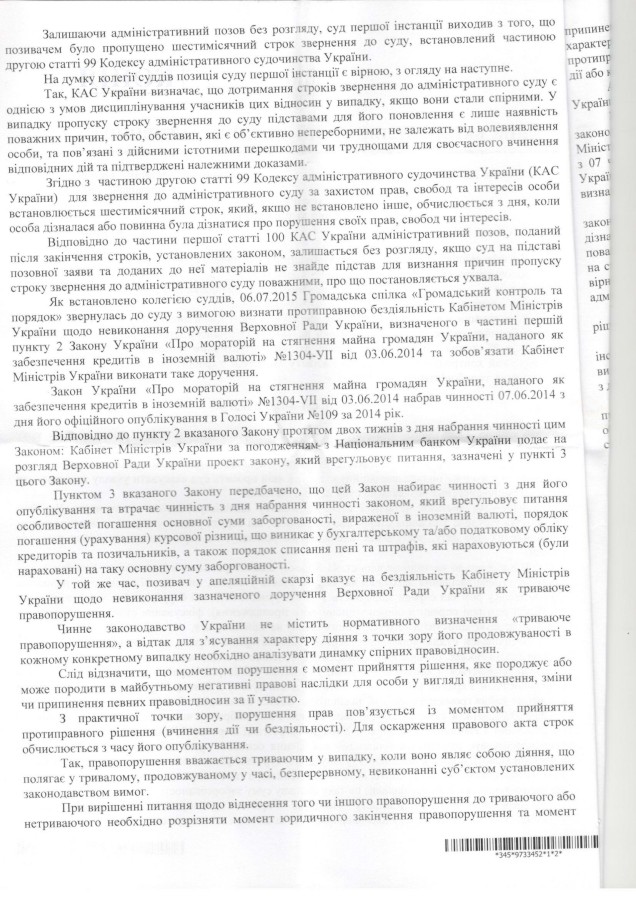 Окружной административный суд города Киева признал противоправной бездеятельность Кабинета министров Украины относительно невыполнения поручения Верховной Рады, определенного в части первой пункта 2 Закона Украины «О моратории на взыскание имущества граждан Украины, предоставленного в качестве обеспечения кредитов в иностранной валюте» о реструктуризации валютных кредитов. Об этом говорится в решении Киевского апелляционного административного суда по иску общественного союза «Громадський контроль та порядок» к Кабинету министров Украины от 2 сентября 2015 года.