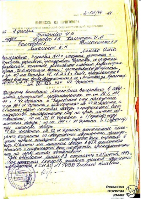 9 декабря 1994 суд признал Ляшко виновным в хищении государственного имущества, присвоении власти, подделке документов. Ему светило 10 лет, но получил только шесть. Позже суд смягчил статью на мошенничество.