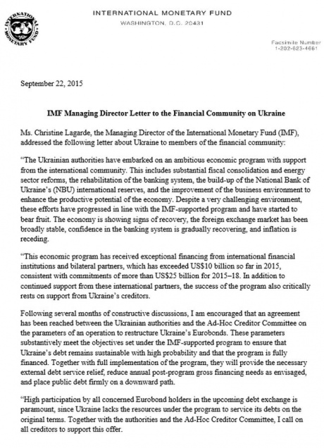Условия реструктуризации долга, о которых Украина договорилась с комитетом кредиторов, соответствуют целям программы МВФ и призваны обеспечить стабильность и предсказуемость долга Украины и финансирования указанной программы в полном объеме.