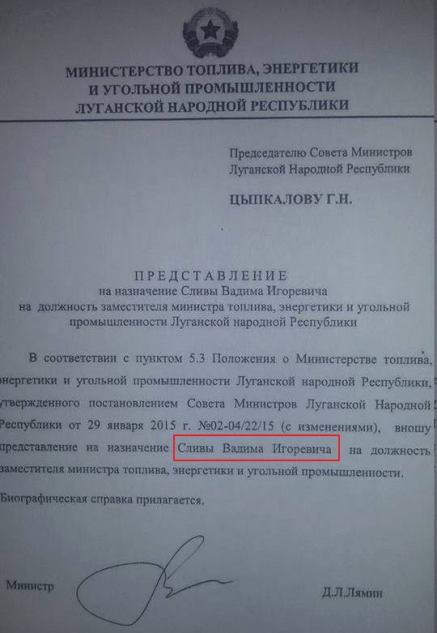 «Помимо должности «замминистра угольной промышленности «ЛНР» Вадим Слива является еще и генеральным директором государственного предприятия «Луганскуголь», которое подчиняется Министерству угольной промышленности Украины. До войны предприятие было зарегистрировано в Луганске, но после оккупации города пророссийскими бандформированиями сменило юридический адрес и теперь официально находится по адресу Киев, переулок Приборный, 2-А. Таким образом, Вадим Слива, еще в январе 2015 года ставший «заместителем министра «ЛНР», весь год прекрасно совмещает работу на обе воюющие стороны», - сообщает СМИ.