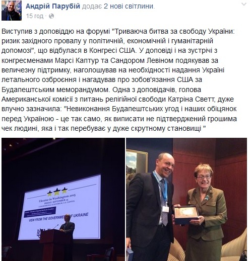 "Выступил с докладом на форуме "Продолжающаяся битва за свободу Украины: риск западного провала в политической, экономической и гуманитарной помощи", состоявшейся в Конгрессе США. В докладе и на встрече с конгрессменами Марси Каптур и Сандором Левином поблагодарил за огромную поддержку, подчеркивал необходимость предоставления Украине летального вооружения и напоминал об обязательствах США по Будапештскому меморандуму", - написал он в своей странице в Facebook.