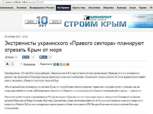 В частности, Крыминформ пишет, что в рамках экономической блокады Крыма украинские активисты намерены «перекрыть морское сообщение с Крымским полуостровом». Якобы эту информацию крымским СМИ сообщил пресс-секретарь «Правого сектора» Алексей Бык.