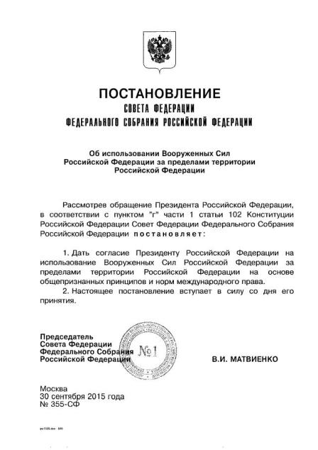 Исходя из документа, российский президент Путин имеет право направить свою армию куда угодно и когда угодно. Непосредственно о «военной помощи» Сирии, куда были брошены вчера ВВС Росси, в данном документе не сказано.