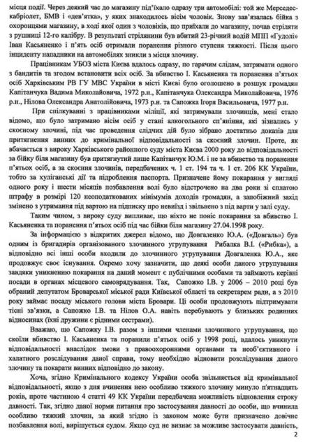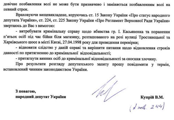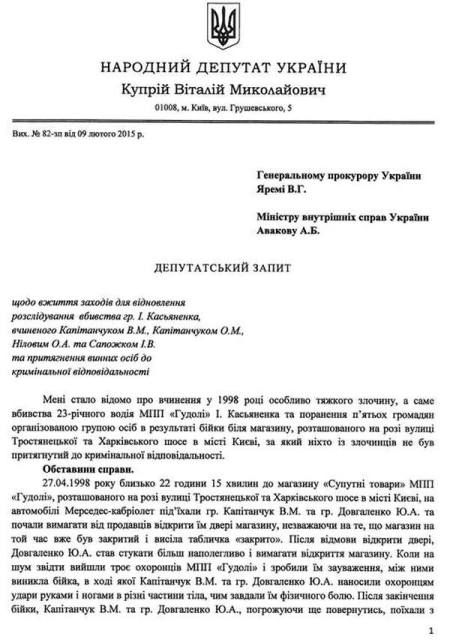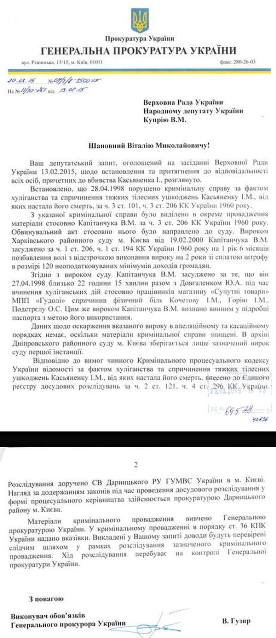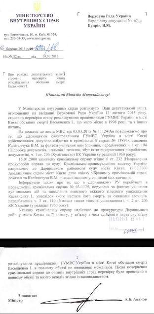 Между тем, на запрос народного депутата Украины В.Куприя в МВД и Генпрокуратуру министр А.Аваков и и.о. Генпрокурора В.Гузырь в марте 2015 г. в официальных письмах подтвердили возвращение неправомерно закрытого дела на доследование.