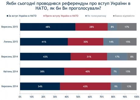 Против такой идеи высказались 28% опрошенных, 8% не приняли бы участия в голосовании, а 17% не определились. Судя по данным социологической группы, показатель поддержки вступления в НАТО на данный момент является рекордным и растет большими темпами. Так, по состоянию на июль этого года за эту идею высказывался 41% украинцев, а 30% были против.