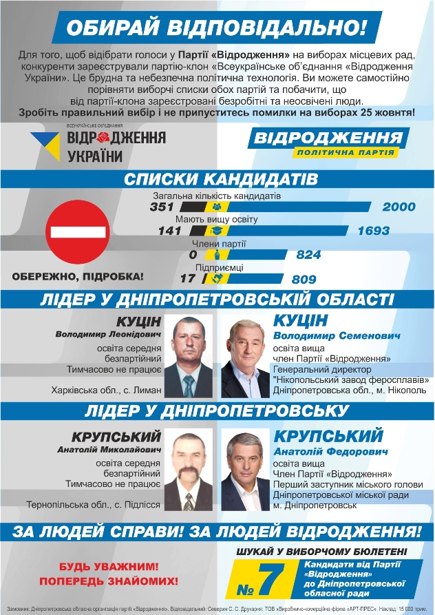Та же манипуляция использована на уровне городской организации, где список кандидатов технической партии «Всеукраїнське об’єднання «Відродження України» возглавляет безработный из Тернопольской области Анатолий Николаевич Крупский, тогда как главой Днепропетровской городской организации настоящей партии «Відродження» является первый заместитель городского головы Анатолий Федорович Крупский.