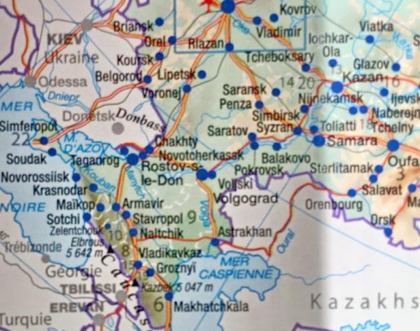На страницах атласа, где изображены Украина, страны Кавказа и прикавказская часть РФ, крымский полуостров обозначен в качестве часть России.
