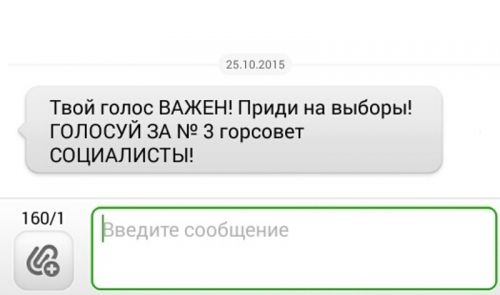 Также сегодня в 9.00 наблюдатель «Опоры» получила sms-сообщение, в котором указано: «Твой голос важен! Приди на выборы! Голосуй за №3 горсовет СОЦИАЛИСТЫ!».