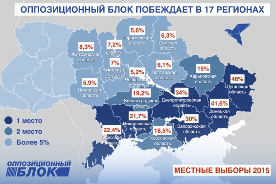 В Оппозиционном блоке заявляют, что политсила побеждает в 7 областях Украины. Согласно предварительным параллельным подсчетам оппозиции, они лидируют в Днепропетровской, Донецкой, Запорожской, Кировоградской, Луганской, Николаевской, Одесской областях.