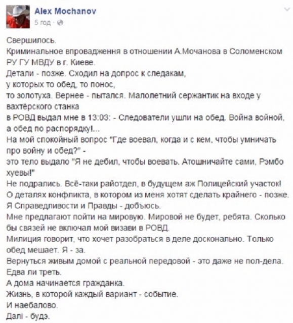 «Малолетний сержантик на входе у вахтёрского станка в РОВД выдал мне в 13:03: - Следователи ушли на обед. Война войной, а обед по распорядку!… На мой спокойный вопрос «Где воевал, когда и с кем, чтобы умничать про войну и обед?» - это тело выдало «Я не дебил, чтобы воевать. Атошничайте сами, Рэмбо х..вы!» Не подрались. Всё-таки райотдел, в будущем аж Полицейский участок», - написал Мочанов.