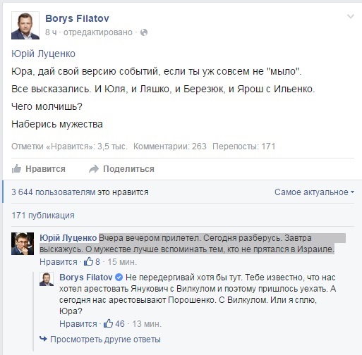«Вчера вечером прилетел. Сегодня разберусь. Завтра выскажусь. О мужестве лучше вспоминать тем, кто не прятался в Израиле», - написал он в ответ на призыв Филатова прокомментировать задержание Корбана.