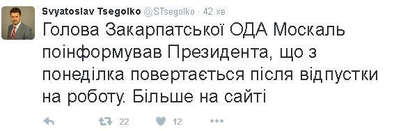 Руководитель Закарпатской ОГА Геннадий Москаль сообщил президенту Петру Порошенко о том, что с понедельника, 9 ноября, он возвращается на работу из отпуска. Об этом написал пресс-секретарь президента Святослав Цеголко на своей страничке в соцсети Twitter.