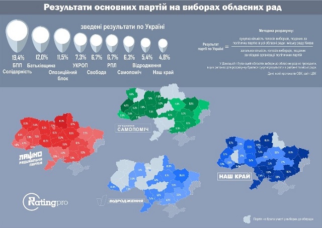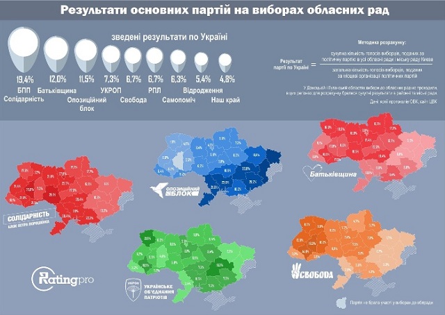 Сообщается, что Блок Петра Порошенко Солидарность на выборах в областные советы набрал 19,4% голосов избирателей. Батькивщина получила 12% голосов, Оппозиционный блок - 11,5% голосов, Укроп - 7,3% голосов, ВО Свобода и Радикальная партия Олега Ляшко получили по 6,7% голосов, Объединение Самопомич - 6,3%, Видродження - 5,4% голосов, а Наш край - 4,8%.