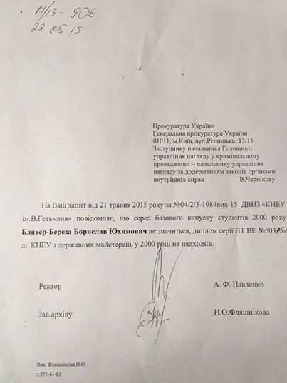 «Среди базового выпуска студентов 2000 Бляхер-Береза Борислав Ефимович не значится, диплом серии ЛТ ВЕ №503758 в КНЭУ с государственной мастерской не поступал», - говорится в официальном ответе ректора Павленко.
