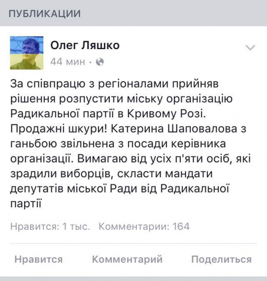 «За сотрудничество с регионалами принял решение распустить городскую организацию Радикальной партии в Кривом Роге. Продажные шкуры! Екатерина Шаповалова с позором уволена с должности руководителя организации», - заявил политик.